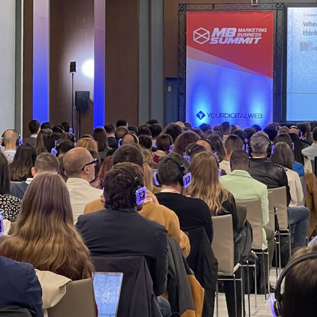 L’evento si è svolto all’interno dell’hotel Melià di Milano, la sala scelta ha ospitato interventi di relatori di grande rilievo nel mondo del Marketing sia a livello nazionale che internazionale. Data la diversa provenienza dei relatori, gli interventi non erano soltanto in lingua italiana ma anche in inglese ed è al pubblico sia presente che collegato in live streaming è stata data la possibilità di scegliere la lingua d’ascolto. Ai partecipanti in sala sono state fornite delle comode e professionali cuffie Silent Disco, che hanno permesso un ascolto dei traduttori nitido e preciso. Allo stesso modo i partecipanti collegati da remoto hanno potuto scegliere tra un canale dedicato alla lingua italiana o ad un secondo in lingua inglese.